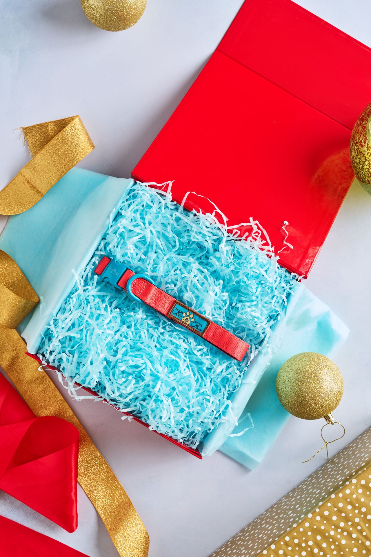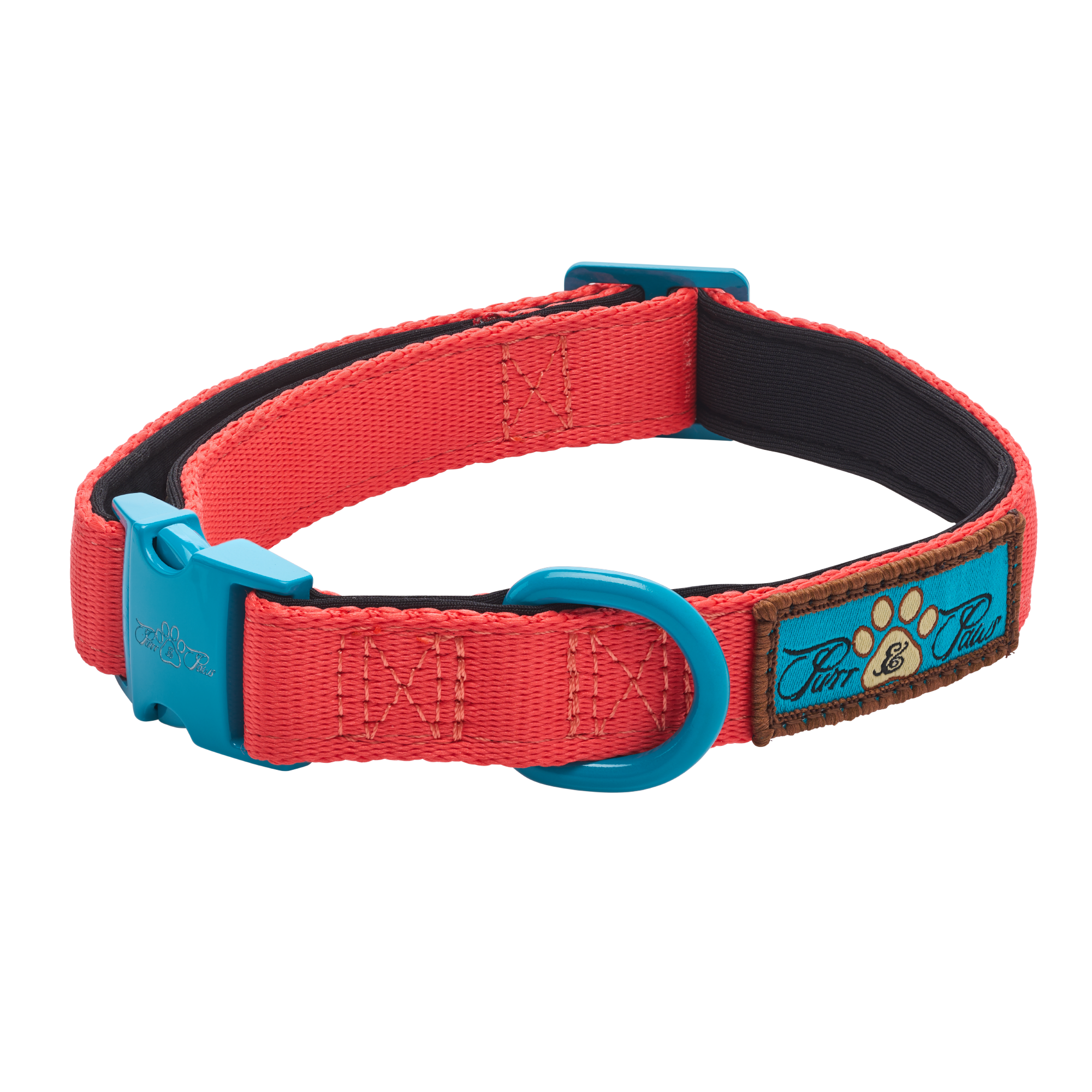 It is manufactured from 40% Polyester, 35% Neoprene SBR, and 25% Zinc Alloy and features a Purr & Paws embroidered motif. It is available in three sizes (S) (M) (L) and three colours: Noir le Bronze (Black with dark bronze contrasting metal buckle and clip), Citrus Azure (Orange with teal contrasting metal buckle and clip), and Azure le Bronze (Teal with Bronze contrasting metal buckle and clip).